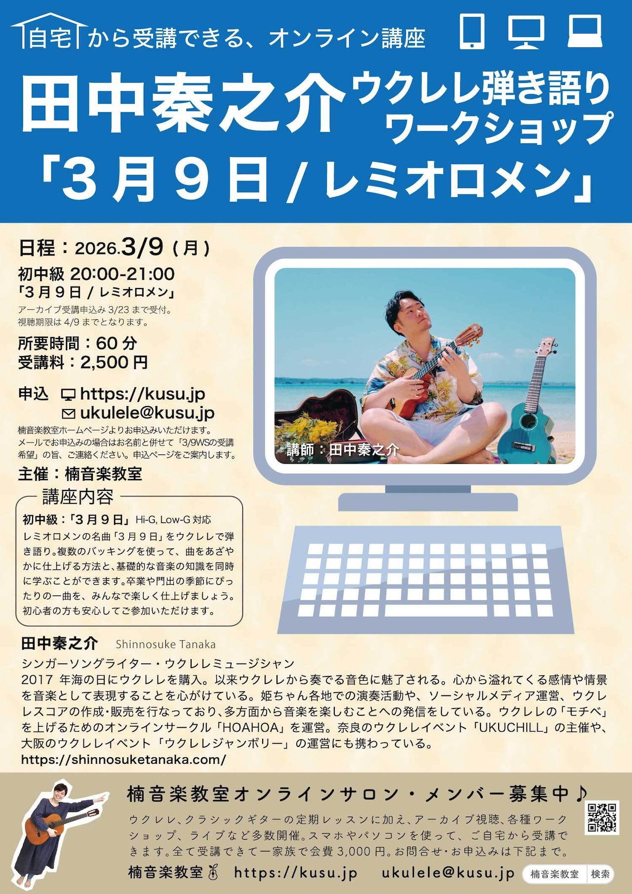 3/9(日)20:00- 田中秦之介 ウクレレ弾き語りWS「3月9日」