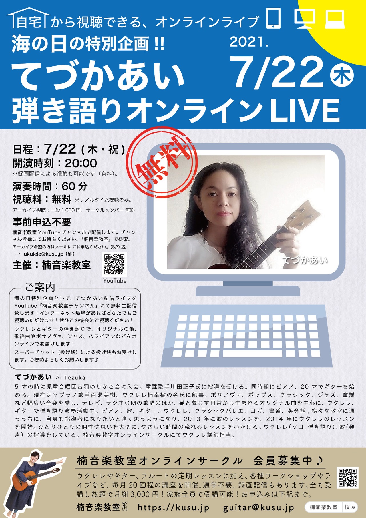 7/22(木・祝)20:00-「てづかあい 弾き語りオンラインLIVE」アーカイブ視聴申込み
