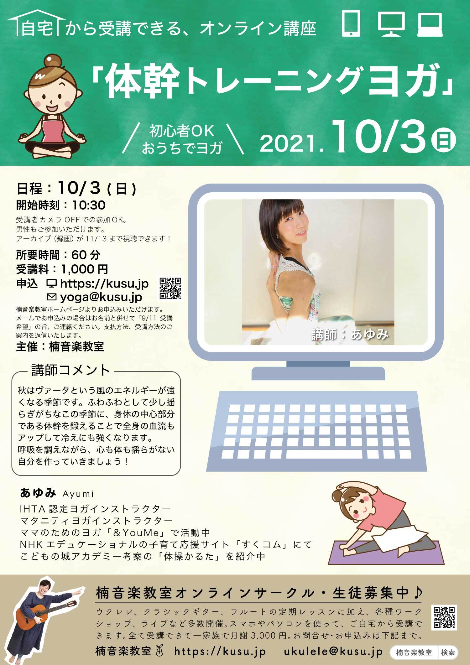 「秋はヴァータという風のエネルギーが強くなる季節です。ふわふわとして少し揺らぎがちなこの季節に、身体の中心部分である体幹を鍛えることで全身の血流もアップして冷えにも強くなります。呼吸を調えながら、心も体も揺らがない自分を作っていきましょう!」