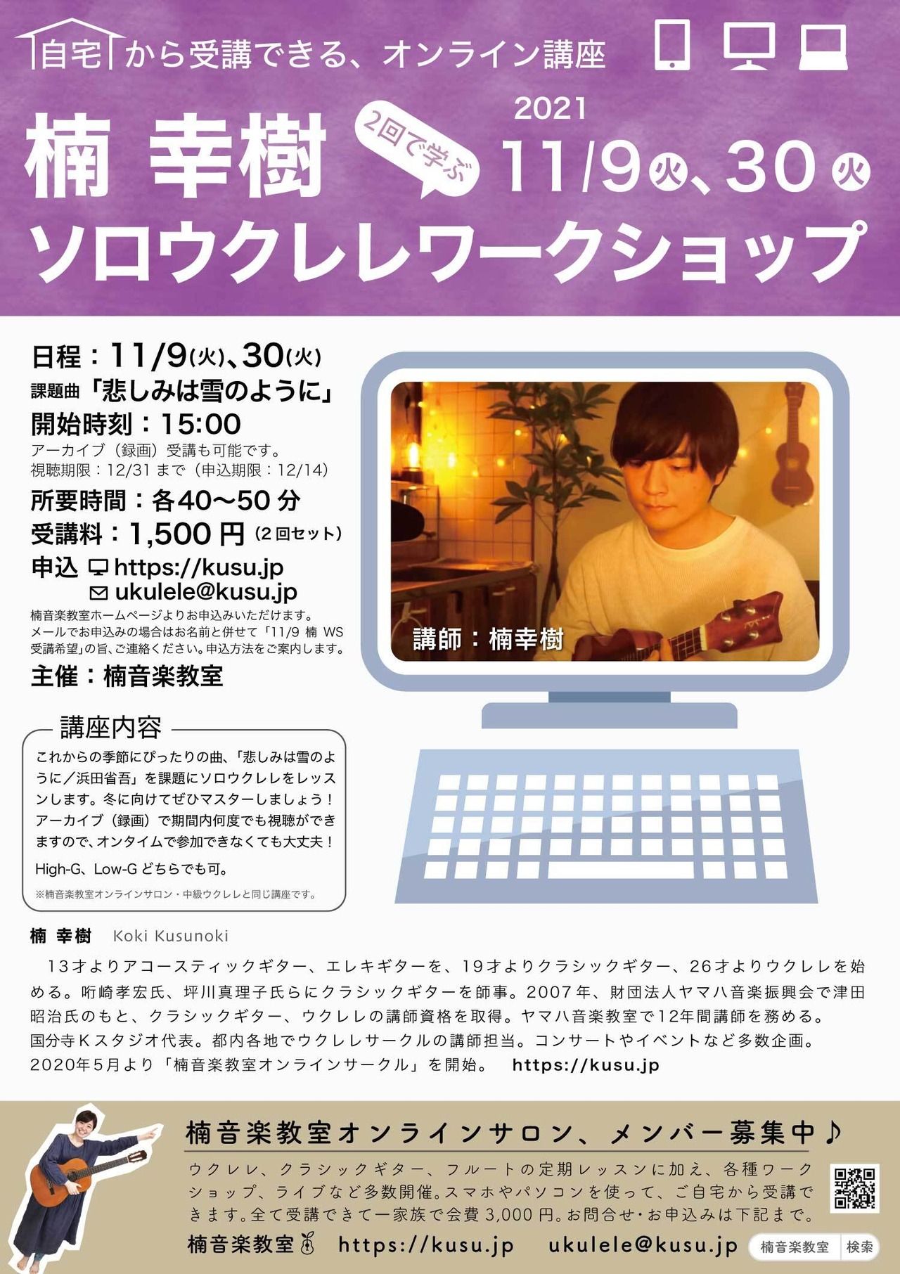 11/9(火)、30(火)「楠幸樹ソロウクレレワークショップ」