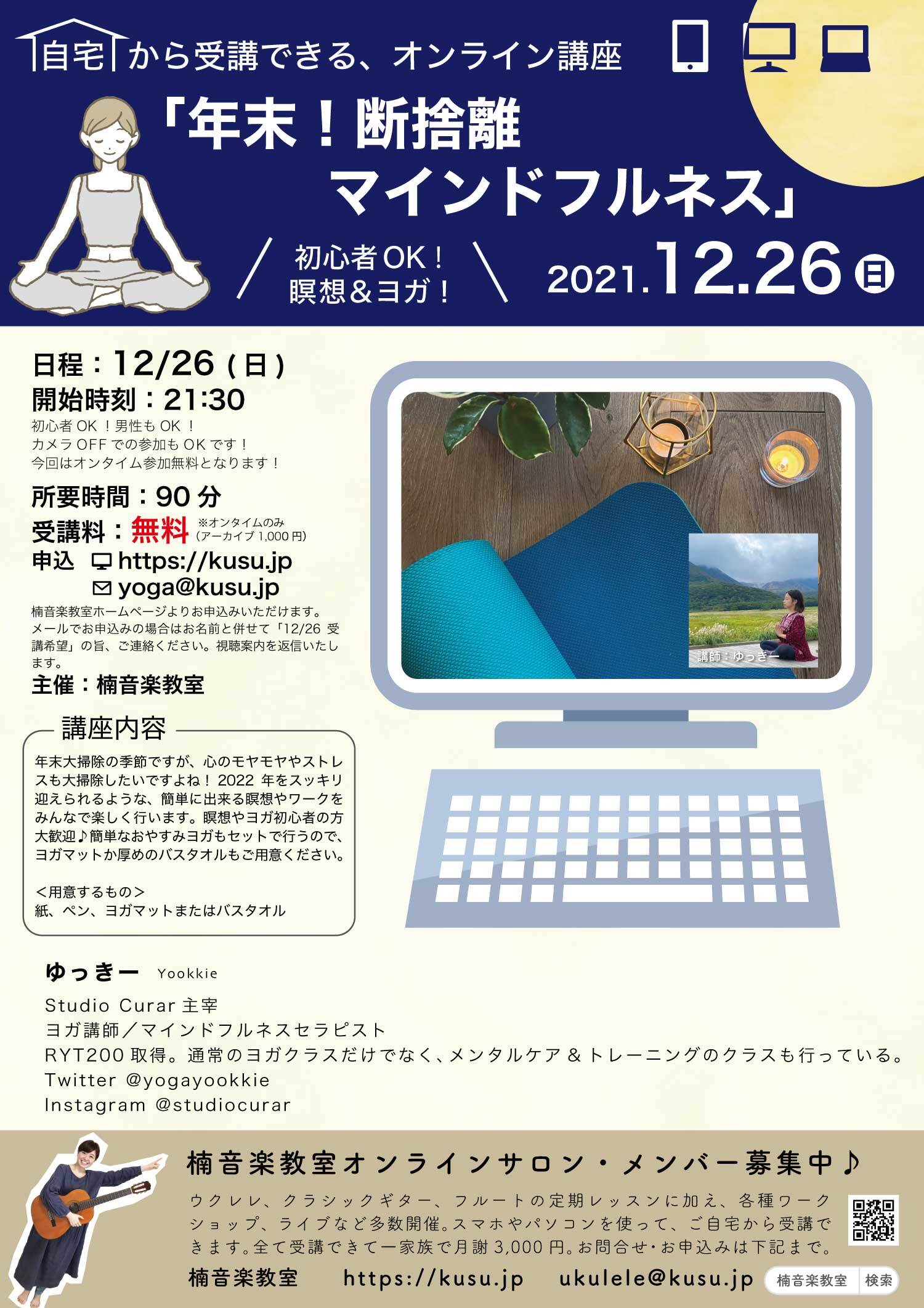 12/26(日)21:30-「年末!断捨離マインドフルネス&おやすみヨガ」アーカイブ申込み