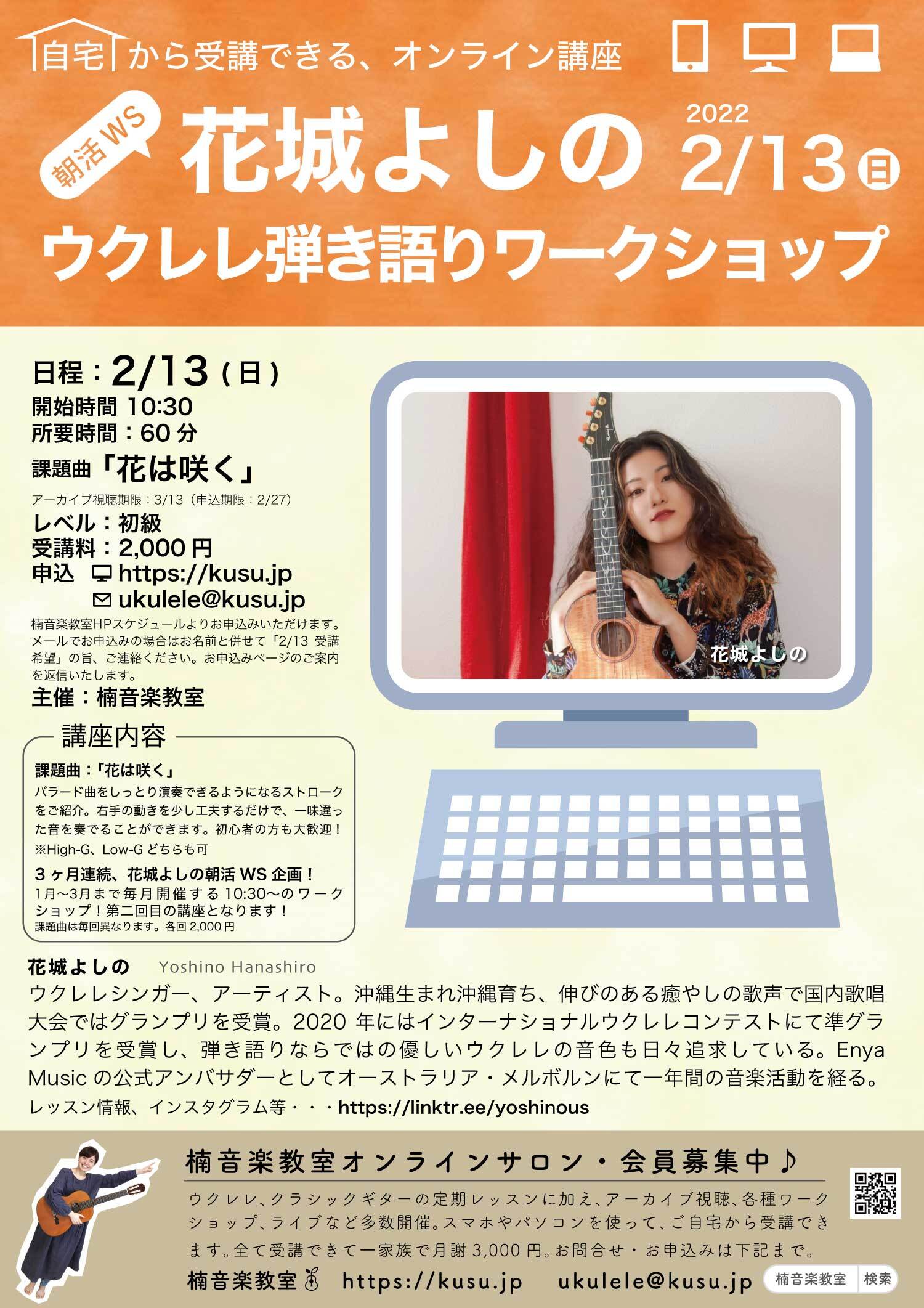 「朝活WS!花城よしの ウクレレ弾き語りワークショップ」2月申し込み