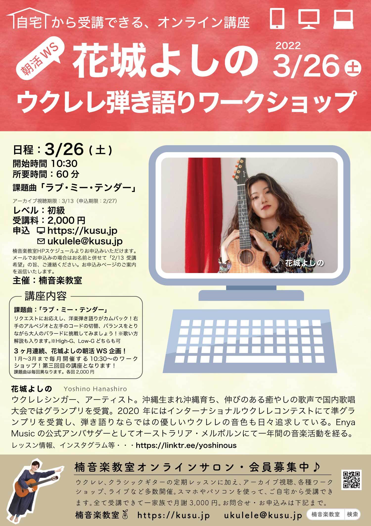 「朝活WS!花城よしの ウクレレ弾き語りワークショップ」3月申し込み