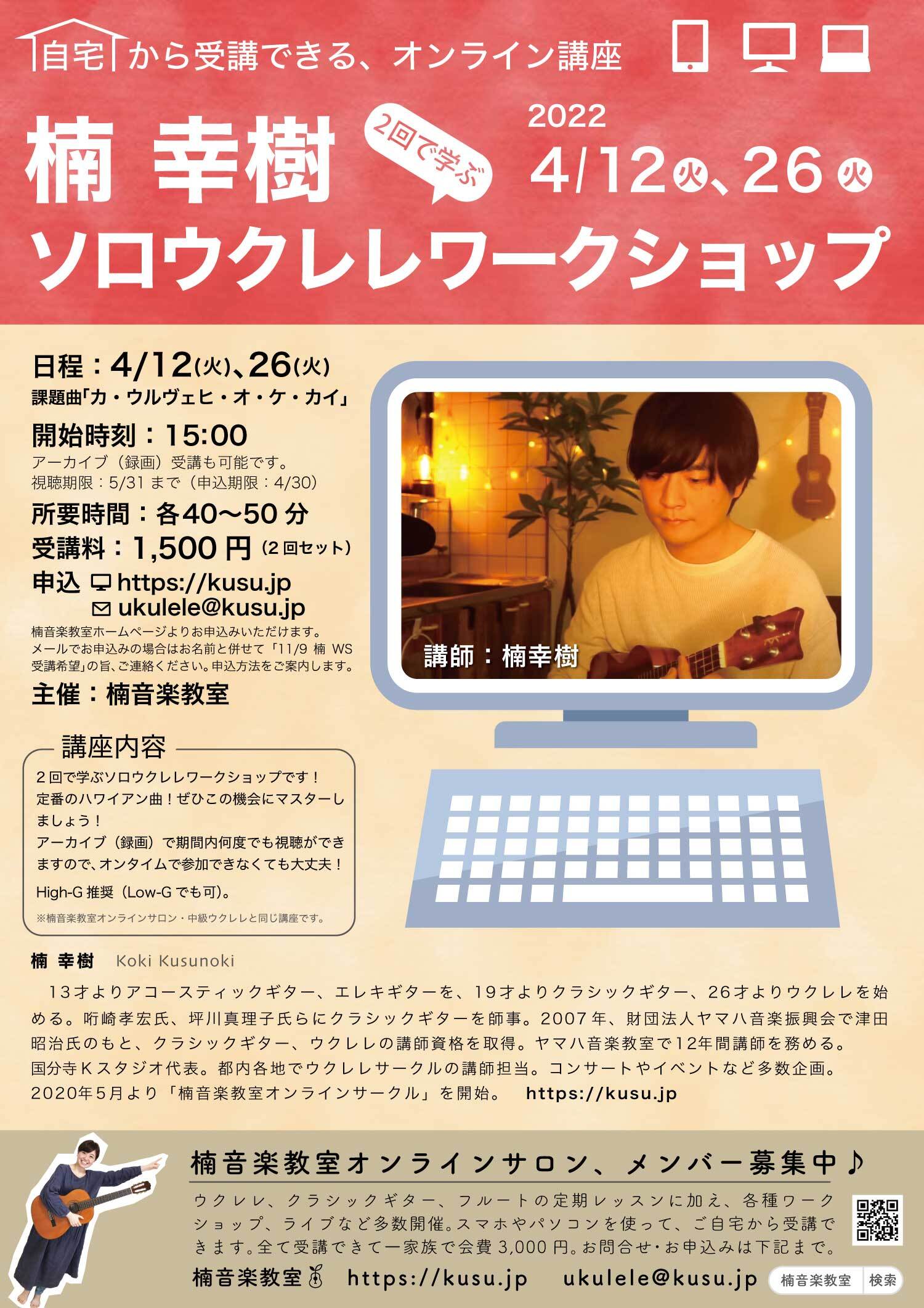 【アーカイブ】4/12(火)、26(火)15:00- 楠幸樹ソロウクレレWS