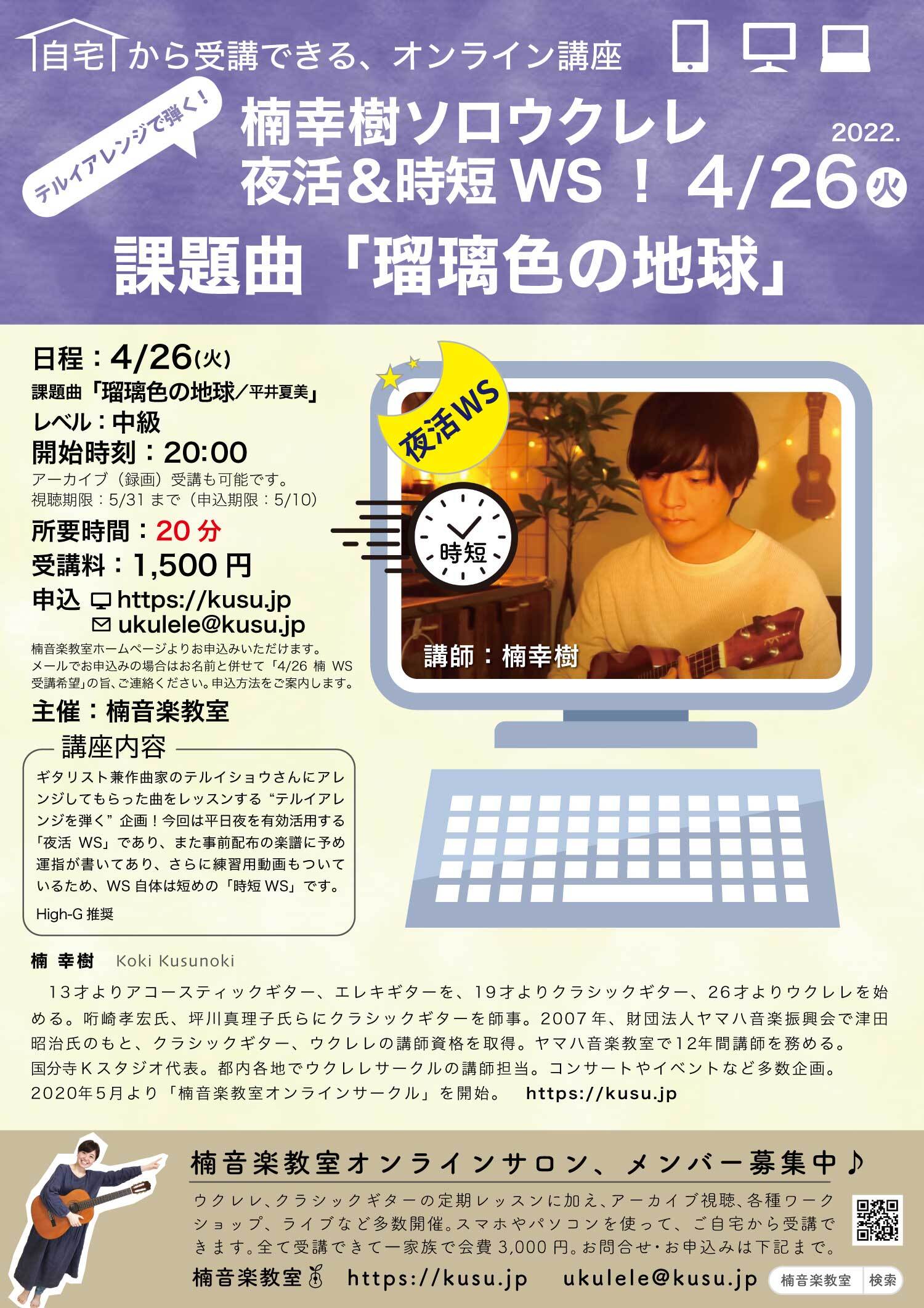 【アーカイブ】4/26(火)20:00- 楠幸樹ソロウクレレWS「瑠璃色の地球」