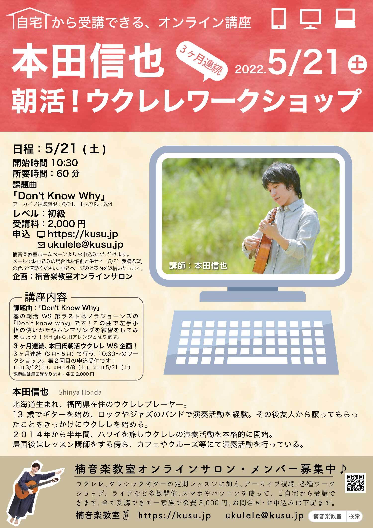 5/21(土)10:30-「本田信也 朝活!ウクレレワークショップ」申込み