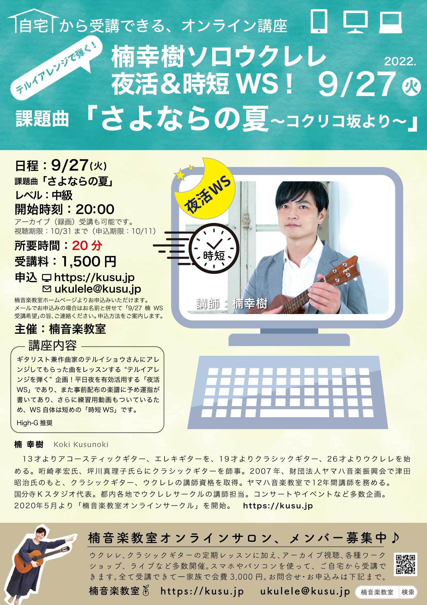 【アーカイブ】9/27(火)20:00- 楠幸樹ソロウクレレWS「さよならの夏」
