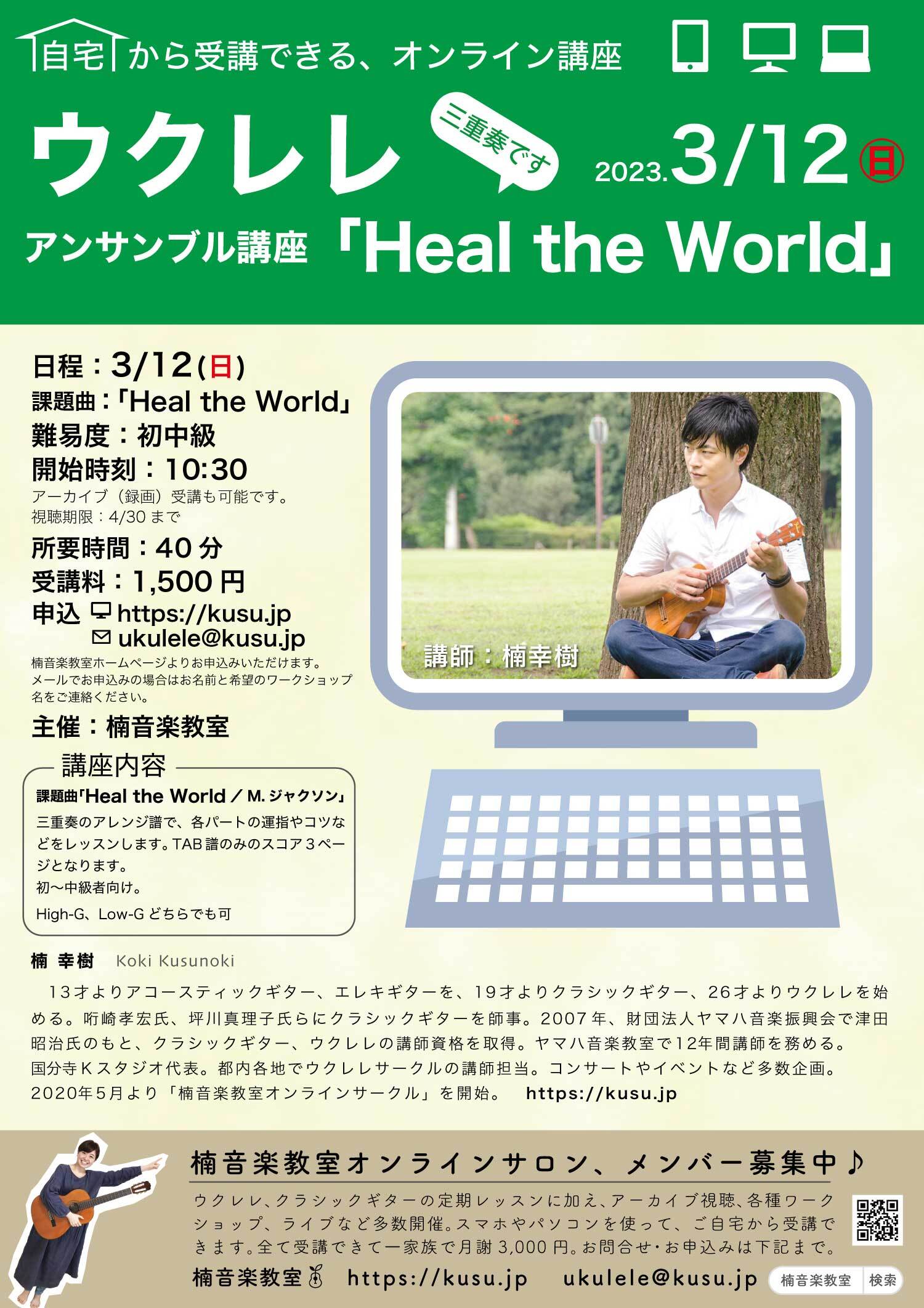 【アーカイブ】3/12(日)10:30- 楠幸樹ウクレレアンサンブル講座「Heal the World」(三重奏)