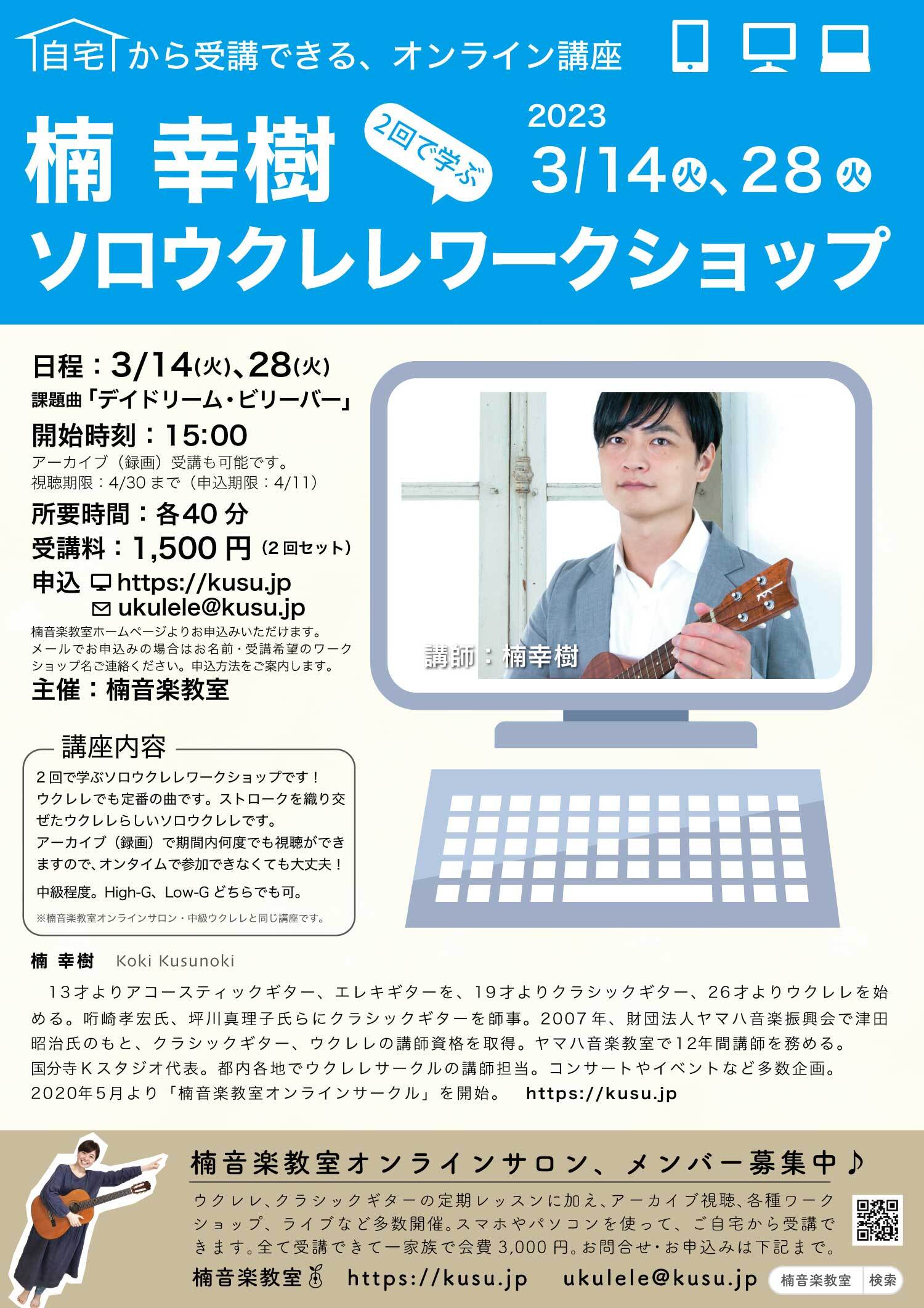 3/14(火)、28(火)「楠幸樹ソロウクレレワークショップ」申込み